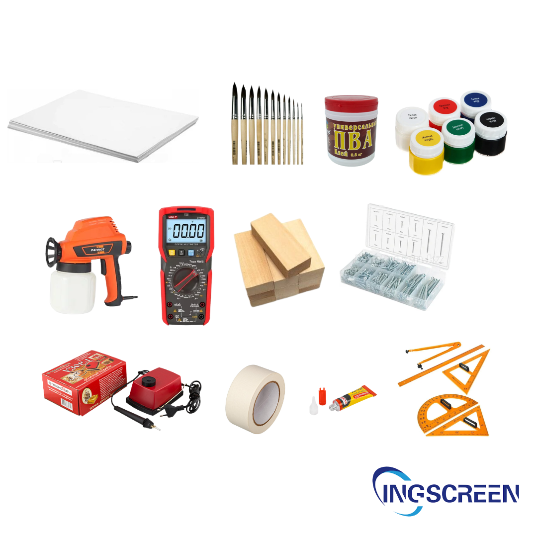 1. Renovator multi-tool2. Electric hand planer3. Heat gun4. Grinding machine5. Electric bench grinder6. Drawing paper sheets7. Round fine art brush (squirrel hair)8. PVA glue9. Acrylic paint set, 6 colors10. Paint spray gun11. Digital multimeter12. Wooden bar set, 14 pcs13. Wood screw set14. Wood burning tool15. Masking tape16. Super glue 3 g17. Set of drafting tools for blackboard, 5 items18. Plastic pipe welding machine19. Wood chisel 8 mm20. Wood chisel 16 mm21. Hand clamp22. Cold chisel23. Rivet gun24. Rivets 3.2 × 8 mm, 50 pcs25. Center punch26. Rubber mallet27. Pliers28. Pipe wrench29. Side cutting pliers30. Measuring tape 1 m31. Metal ruler 30 cm32. Metal ruler 100 cm33. Locksmith hammer 200 g34. Locksmith hammer 400 g35. Open-end wrench set 6–24 mm, 8 pcs36. Tap and die set M3–M1037. Diamond needle file set, 10 pcs38. Tweezers39. Square file40. Round file41. Flat file42. Triangular file43. Utility knife 18 mm44. Metal cutting shears 250 mm45. Wood hacksaw 400 mm46. Metal hacksaw 300 mm47. Phillips screwdriver48. Flat screwdriver49. Precision screwdriver set50. Combination pliers51. Hacksaw blades for metal 300 mm52. Metal single hand planer53. Tape measure 5 m54. Wood drill bit set, 8 pcs55. Metal drill bit set 1.0–6.5 mm, 13 pcs56. Plastic miter box with saw57. Pipe cleaning cable58. Pipe bender for metal-plastic and soft metal pipes59. Pipe cutter for metal-plastic pipes60. Metal set square 300 mm61. Plumbing pipe clamp62. Vernier caliper63. Cleaning brush64. Tool storage box65. Electric engraver with mini accessory set66. Electric drill67. Cordless drill driver68. Electric jigsaw69. Electric miter saw70. Mini circular saw |
