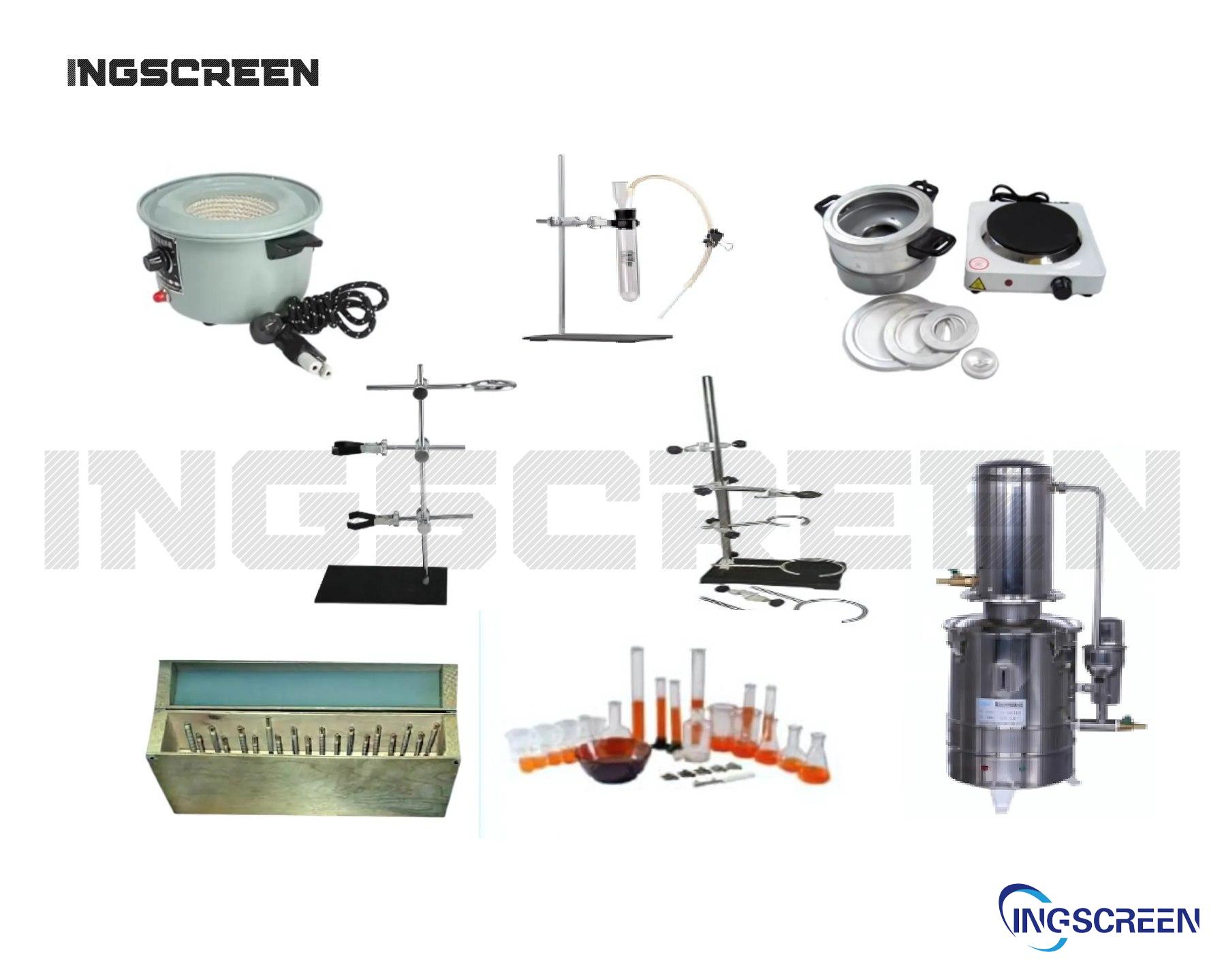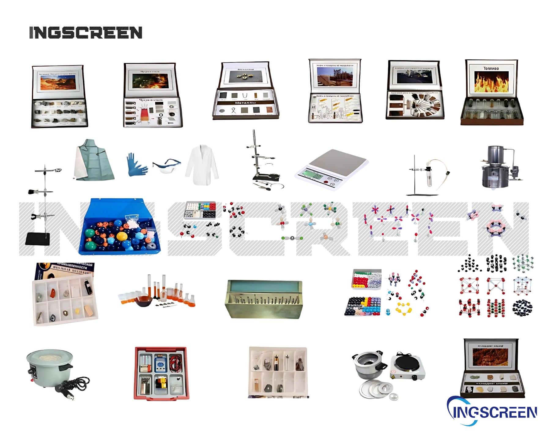 Contents 1. Combined laboratory bath; 2. Electronic scales up to 200 g (0.1 g); 3. Distiller; 4. Flask heater; 5. Set of hydrometers (19 pcs.); 6. Atom models for students and teacher; 7. Set of glassware and accessories for chemistry laboratory work; 8. Electrochemistry experiment set; 9. Laboratory gas collection apparatus; 10. Chemical laboratory stand; 11. Universal stand for teacher; 12. Set of demonstration crystal lattice models; 13. Set of large-scale molecular models; 14. Set of organic and inorganic molecular models for students and teacher; 15. Set of p- and s-bond formation models; 16. Set of p- and d-orbital and ball-and-stick molecular models; 17. Set of electron cloud and chemical bond models; 18. Collection “Coal and its processing products”; 19. Collection “Metals”; 20. Collection “Minerals and rocks”; 21. Collection “Oil and its processing products”; 22. Collection “Raw materials for the fuel industry”; 23. Collection “Raw materials for the chemical industry”; 24. Collection “Fuels”; 25. Collection “Cast iron and steel”; 26. Collection “Hardness scale”; 27. Set of personal protective equipment.