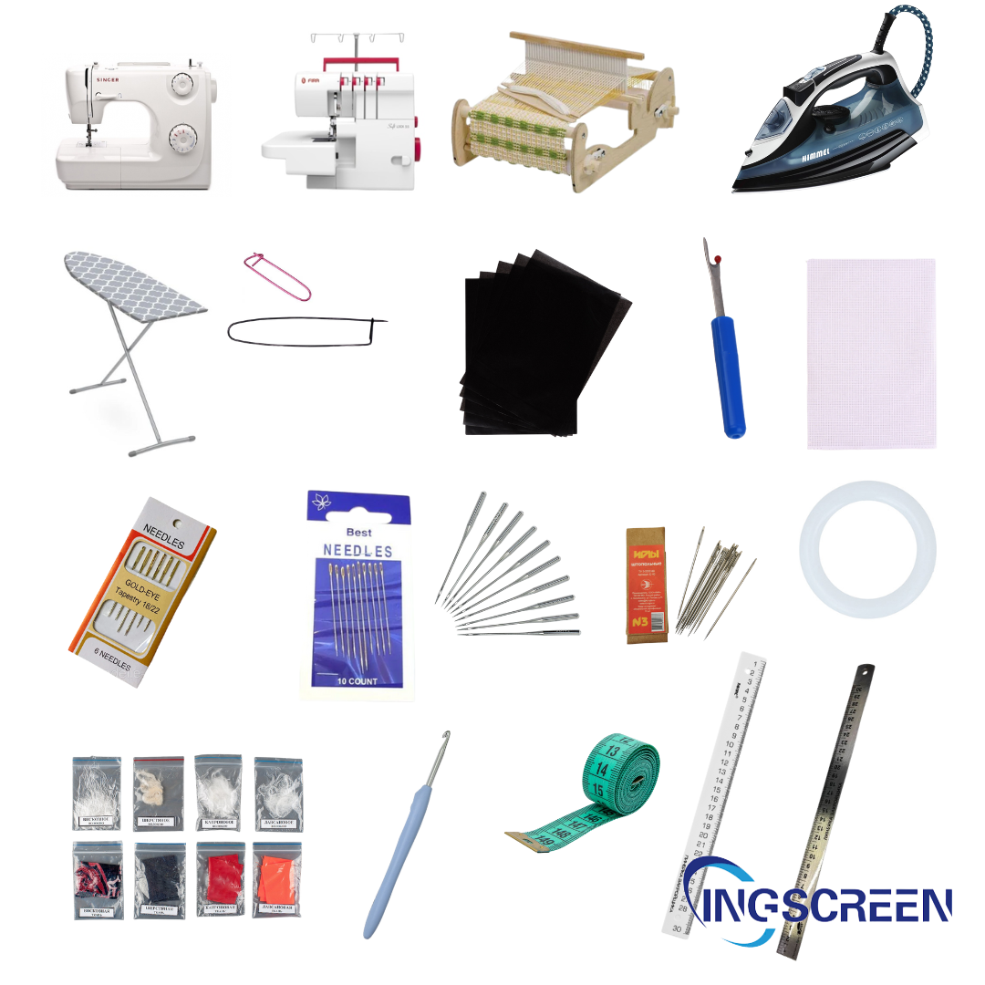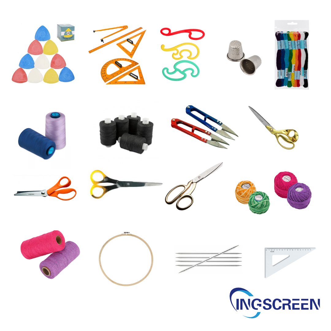 1. Sewing machine2. Overlock machine3. Manual weaving loom4. Iron5. Floor ironing board6. Knitting pins7. Tailor pins8. Carbon paper9. Seam ripper10. Embroidery needles11. Hand sewing needles12. Sewing machine needles13. Darning needles14. Plain embroidery canvas15. Fabric samples collection for 12 students16. Knitting rings17. Crochet hooks18. Measuring tape 1 m19. Pattern maker ruler 30 cm20. Metal ruler 30 cm21. Colored triangular tailor chalk22. Set of drafting tools for blackboard, 5 items23. Set of plastic pattern templates, 3 pcs24. Thimble25. Colored embroidery floss threads26. Polyester threads27. Reinforced sewing threads 5000 m28. Thread trimming scissors29. Tailor scissors30. Zigzag scissors31. Office scissors32. Large tailor scissors33. Crochet yarn 10 g34. Knitting yarn 50 g35. Weaving yarn in skeins36. Round embroidery hoop37. Knitting needles38. Plastic set square, 60 g |