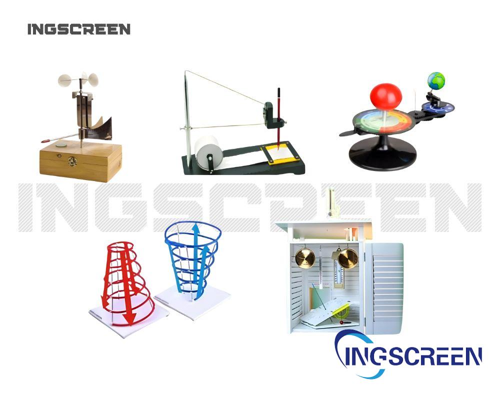 1. Illuminated star globe, 320 mm; 2. Political Earth globe, 320 mm; 3. Physical Earth globe, 150 mm; 4. Moon globe, 320 mm; 5. Mars globe, 320 mm; 6. Geography model “Crustal shifts and faults”; 7. Geography model “Structure of the Earth”; 8. Geography model “Structure of the seabed relief”; 9. Model “Sun–Earth–Moon (Tellurium)”; 10. Cyclone and anticyclone model; 11. Collection “Minerals and rocks”; 12. Collection “Mineral resources”; 13. Aneroid barometer; 14. Hygrometer; 15. Electronic rangefinder; 16. School compass; 17. Curvimeter; 18. Measuring tape; 19. Maximum–minimum thermometer; 20. Seismograph model; 21. Weather vane; 22. Weather station. |