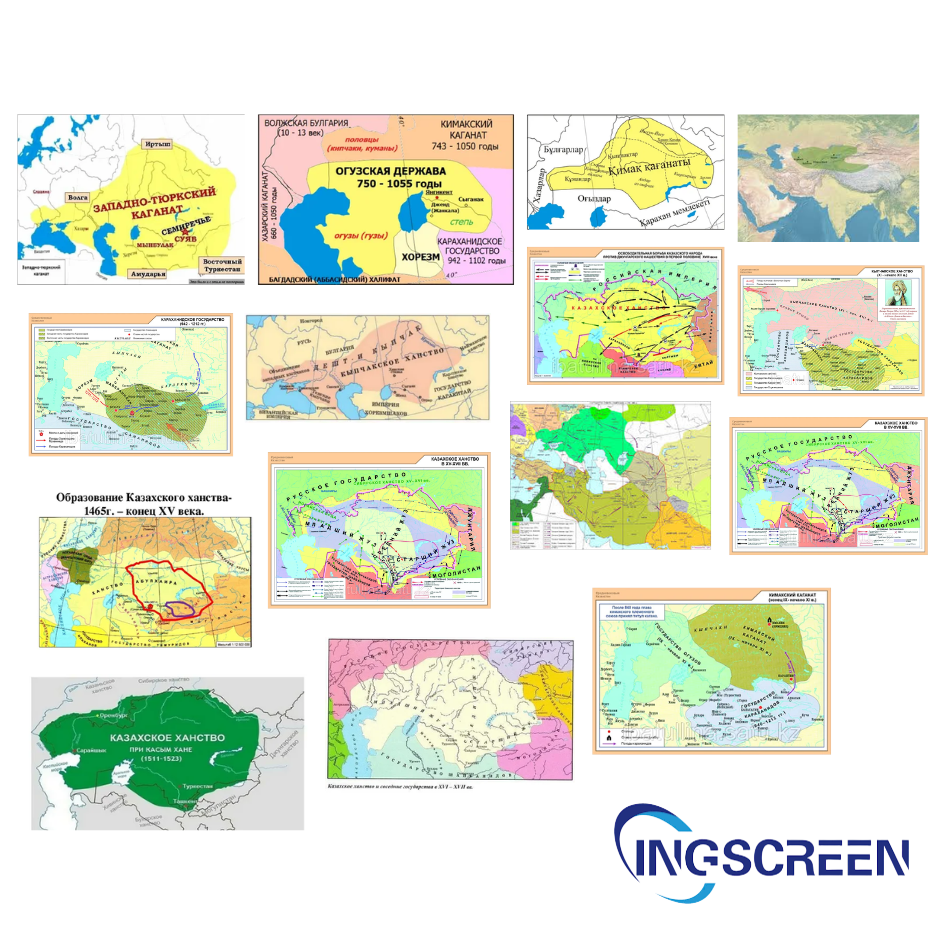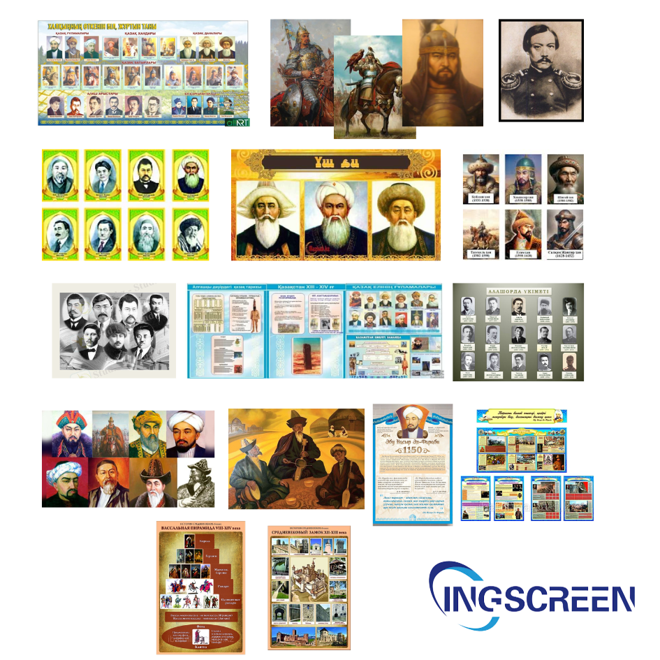 1. Portraits on history “National Leaders”, A3 (42×30 cm), 19 pcs. 2. Portraits “Kazakh Batyrs”, A3, 18 pcs. 3. Portraits “For History Classroom”, A3, photo paper, 10 pcs. 4. Portraits “Kazakh Biys”, A3, photo paper, 3 pcs. 5. Portraits “Kazakh Khans”, A3, 16 pcs. 6. Portraits “Statesmen”, A3, 19 pcs. 7. Portrait set “For History Classroom”, A3, photo paper, 16 pcs. 8. Portraits “Famous Kazakhs”, A3, photo paper, 12 pcs. 9. Portraits “Heroes of the Great Patriotic War”, A3, 17 pcs. 10. Portraits “Great Figures of Kazakh History”, A3, photo paper, 37 pcs. 11. Portraits “Zhyraus”, A3, 10 pcs. 12. Historians’ portraits in frames with glass, A3, 8 pcs. 13. Portraits “Famous and Historical Figures of Kazakhstan”, A4, 9 pcs. 14. Map “Western Turkic Khaganate”, 100×70 cm. 15. Map “Oghuz State (9–11 centuries)”, 100×70 cm. 16. Map “Kimak Khaganate (9–11 centuries)”, 100×70 cm. 17. Map “Karakhanid State (942–1212)”, 100×70 cm. 18. Map “State of Kara-Khitans (1125–1212)”, 100×70 cm. 19. Map “Kipchak Khanate (11 – early 13 centuries)”, 100×70 cm. 20. Map “Dzungar Invasion”, 100×70 cm. 21. Map “Kazakhstan within the Mongol Empire”, 100×70 cm. 22. Map “States on the Territory of Kazakhstan (13–15 centuries)”, 100×70 cm. 23. Map “Kazakh Khanate (15–17 centuries)”, 100×70 cm. 24. Map “Campaigns of Emir Timur (1336–1405)”, 100×70 cm. 25. Map “Kazakh Khanate: Formation (1465–1466) and Territorial Expansion”, 100×70 cm. 26. Map “Kazakh Khanate (16th century)”, 100×70 cm. 27. Map “Kazakh Khanate (17th century)”, 100×70 cm. 28. Map “Kazakh Khanate at the Beginning of the 18th Century”, 100×70 cm. 29. Wall portraits of historians, 42×30 cm, PVC, 8 pcs. 30. Wall stand “Quote by Al-Farabi”, 240×40 cm. 31. Stand “Ancient History”, 120×80 cm, 2 pcs. 32. Stand “Medieval History”, 120×240 cm. 33. Stand “Modern History”, 120×80 cm, 2 pcs. |
