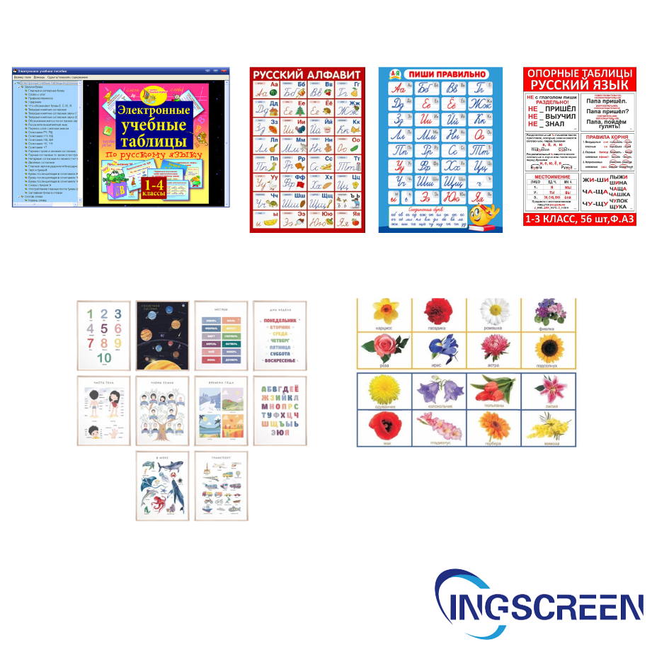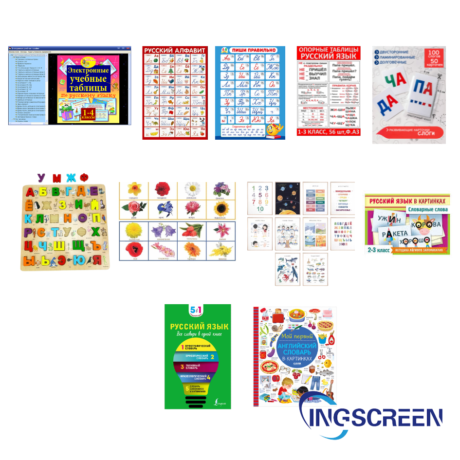 Package Contents 1. Set of electronic charts, posters, and games for studying the Russian language. 2. Posters “Alphabet in Pictures” for the Russian language. 3. Posters “Russian Alphabet (Printed and Cursive) with Transcription”, A2 format. 4. Reference charts on the Russian language. 5. Demonstration set of Russian alphabet letters, A6 format. 6. Set of handout syllable cards in Russian. 7. Thematic posters for language study. 8. Set of number and color names in Russian. 9. Set of cards “Vocabulary Words in Pictures” in Russian. 10. Russian language dictionaries: explanatory, spelling, synonyms, antonyms, grammar reference books. 11. Picture dictionaries.